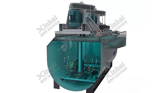 该浮选机工作原理是利用双层伞形叶轮快速搅拌,吸入矿浆、药剂及足量的空气,在叶轮腔、叶轮与定子之间以及定子周边形成强烈的三相紊流场,充气后生成的气泡被切割成适合矿粒浮选的大小,均匀分布在矿浆中,为矿泥浮选提供平台。